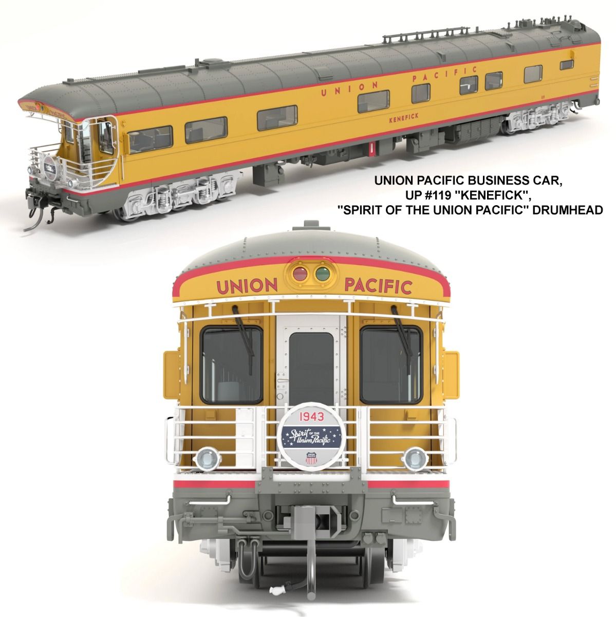 Broadway Limited Imports BLI-9015, HO Union Pacific Business Car, UP #119 "Kenefick", "Spirit of the HO Union Pacific" Drumhead